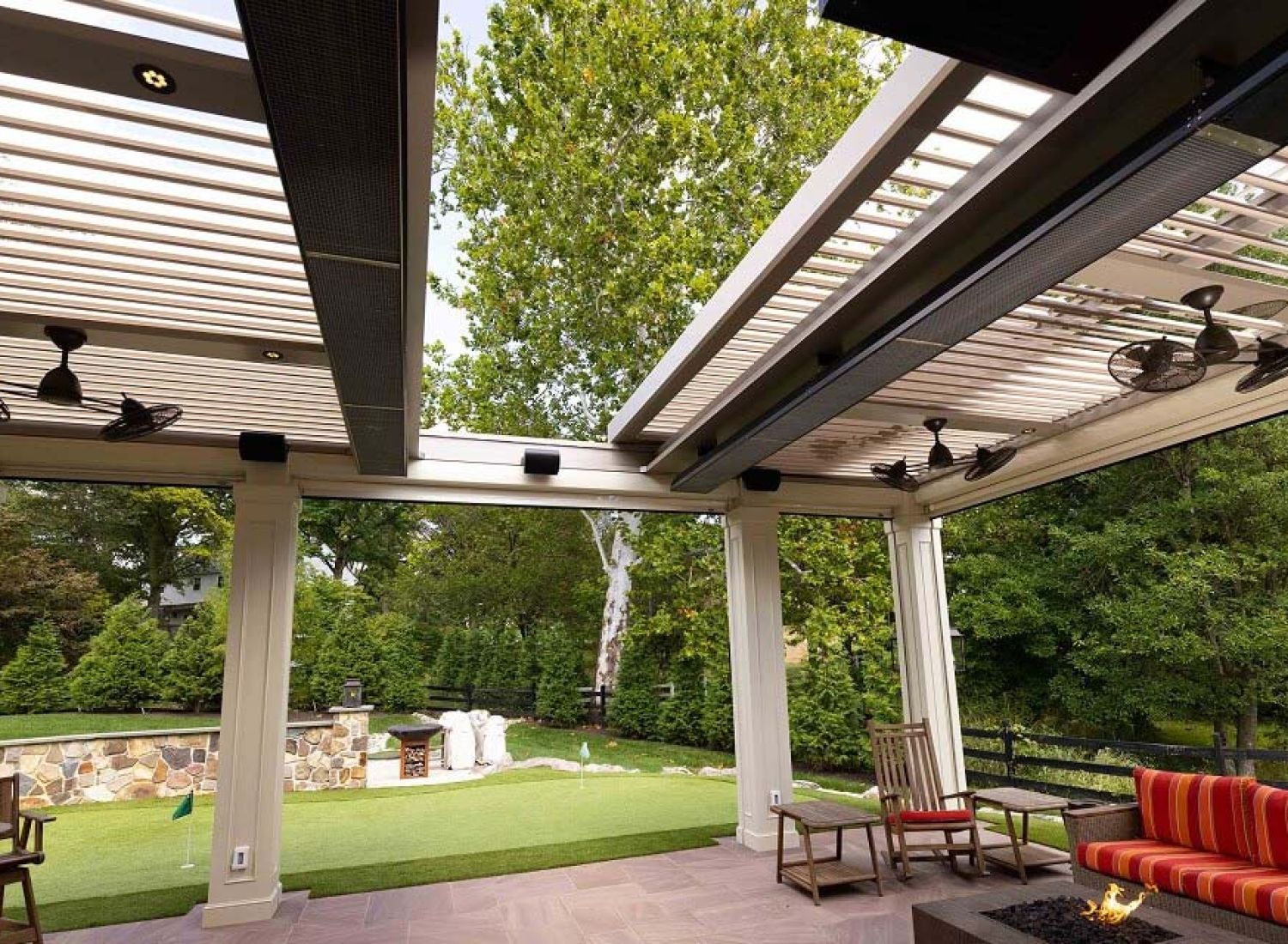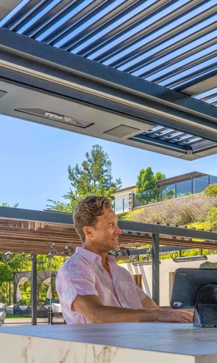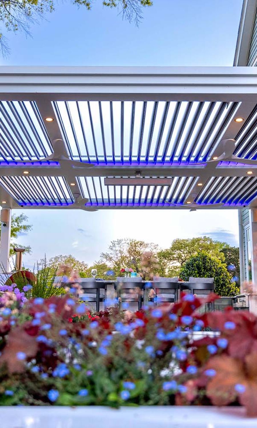 StruXure pergolas feature motorized, pivoting louvers that let you control sunlight, airflow, and rain protection with precision — giving you a beautiful, all-weather outdoor living space year-round.