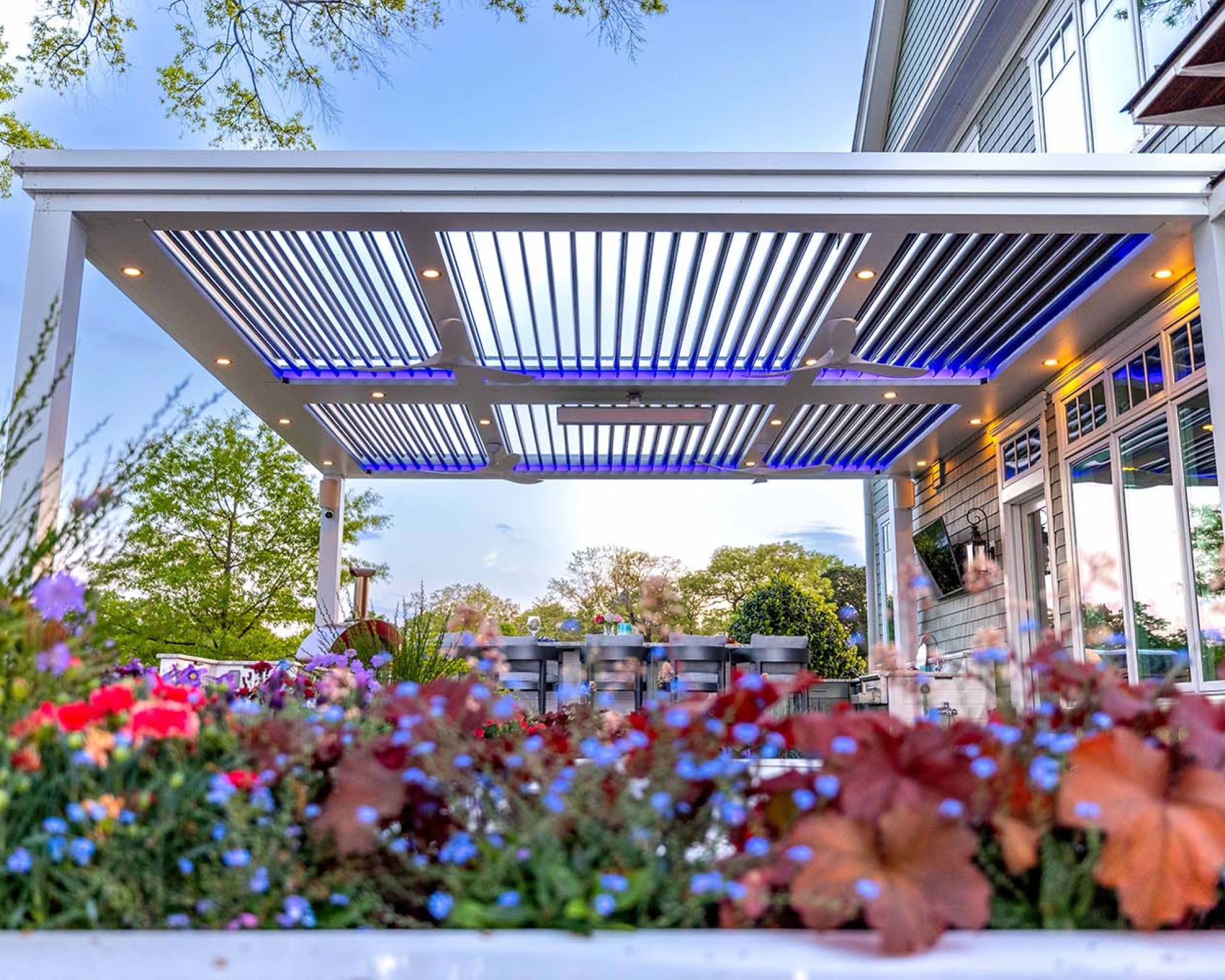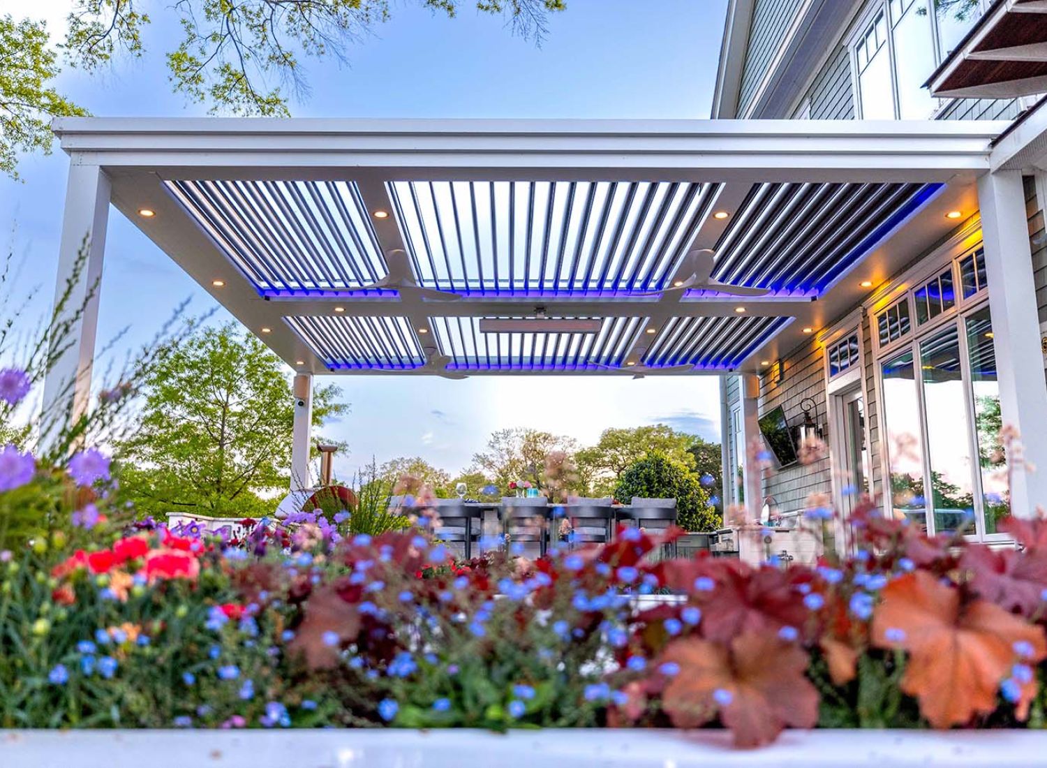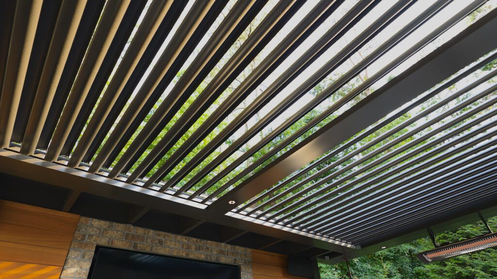 StruXure pergolas feature motorized, pivoting louvers that let you control sunlight, airflow, and rain protection with precision — giving you a beautiful, all-weather outdoor living space year-round.