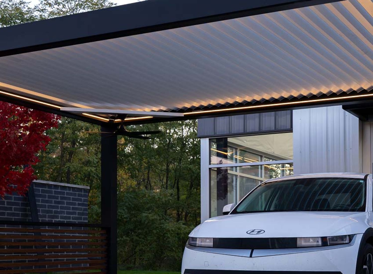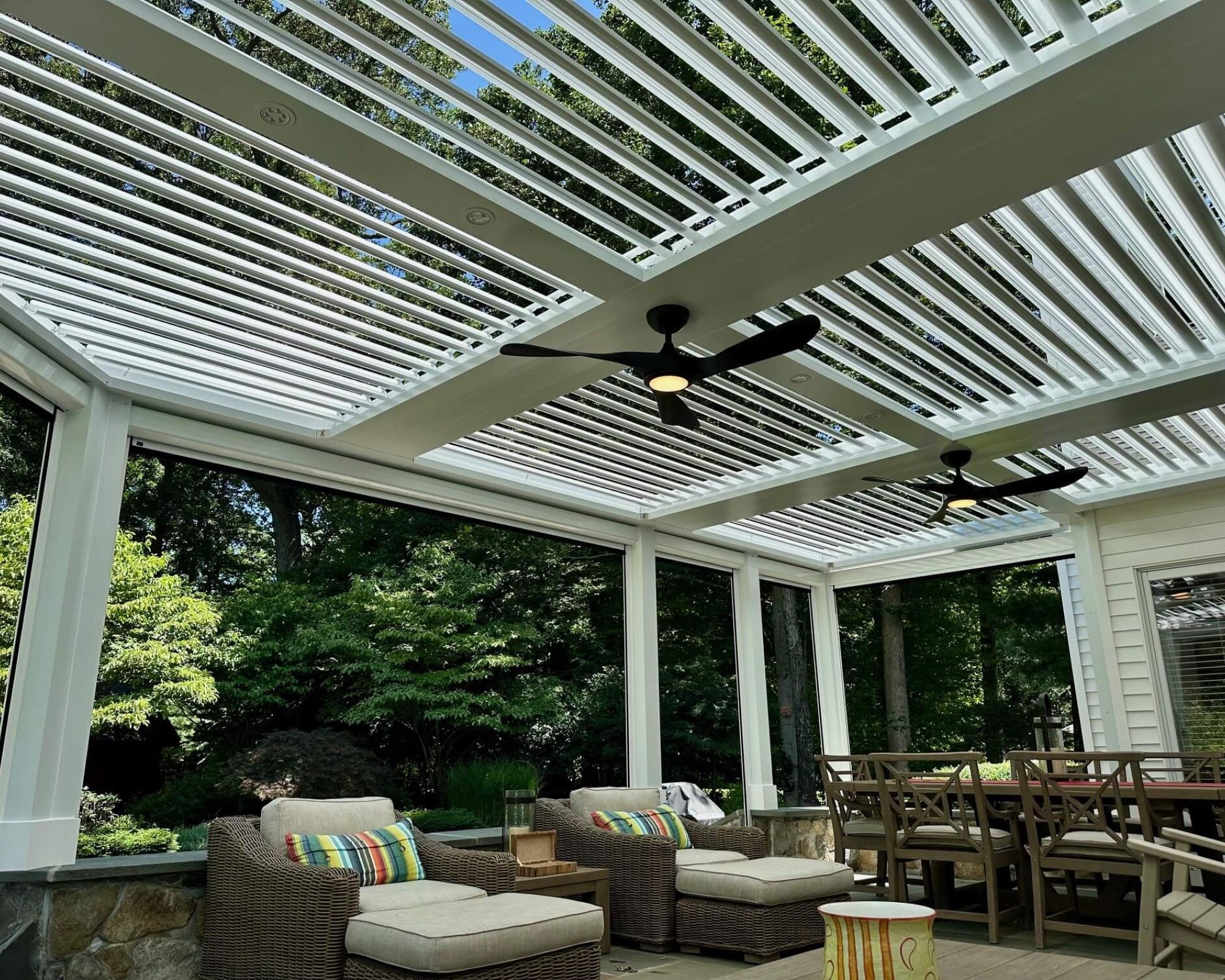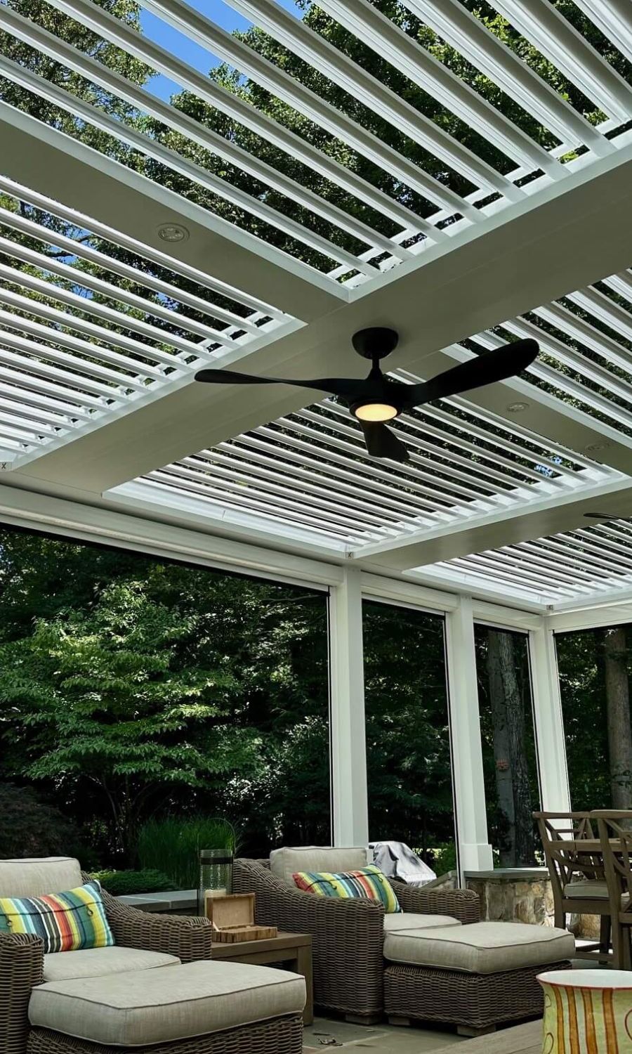 StruXure pergolas feature motorized, pivoting louvers that let you control sunlight, airflow, and rain protection with precision — giving you a beautiful, all-weather outdoor living space year-round.